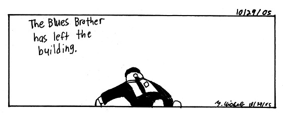 I haven't mastered the art of updating buzzed/drunk so bear with me. I started the day by driving my friend to king of prussia. Traffic is a fucking whore that should be beaten. When we got to where we were going, which was a pitch meeting to sell a timeshare or a vaction deal we were glad. We went to the meeting. The guy we got asked us "your not gonna buy this aren't you" which we responded "no". But he guessed we were rockers and started to talk about his label that is looking to pick up some rock acts. It seems whenever complete strangers ask if we are in a band we get offered something. Unfortuantly the last time it didn't pan out, but it's nice. Next I went to the opening of the student/teacher art show. It was cool. Looked at some art talked with my friends, but I had to go. I was to attend a party. I got to the party around 9, my friends band long finished up playing and was packing up. So I just hung around the party and had a few beers. The party ended at 11 and I went home. Which leads us to now. I drew a comic and put it up. That's about it. Just sitting here alone updating. That's all guys. Thanks again for coming back. See you tomorrow.