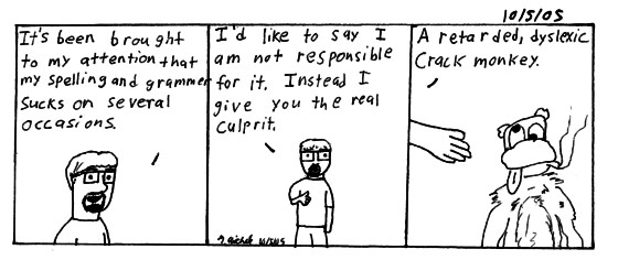 I find it very interesting that what most people find most endearing about this comic, is that it's so poorly done. The lousy borders, the 2 year old style grammer, miss-spells, and the totally crappyness of my drawing.