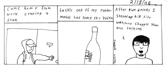 Comic 1 She loved the card, unfortuantly I spelled something wrong (apparently there is a "U" in "thousand"), but she thought it was cute. We ate at outback with my friend Andrew. Looking back I shoulda tried to make it just me and Tiff, because it was our valentines day makeup. Well unfortuanlty the night ended pretty badly. Not going into details, but just rest assured everything is okay.Comic 2 Now I don't drink that often but for some reason I just wanted a stiff drink. I only had two small drinks and lots of water. I just hung around with my roommates, which I rarely do. I didn't get to bed till 3:30. Which sucks because I have a 9 o'clock class.