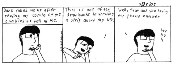 This is the flipside of wanting to be honest in both my comic journal and webjournal. I worry that someone will call me up and bitch at me. Comic 3 Who doesn't want a little attention and validation from time to time? With this comicjournal(and webjournal to a certain extent) I always strive for honesty. I try to ignore the voice that says "You'll regret saying that" or "It'll come back and bite you in the ass". So I intead to just go with it a pray. Thats all for today, enjoy.