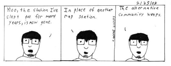 Comic 1 It's like losing a cousin you see once a year but still really like hanging out with. I'm sad it's gone but realize it's just a radio station. However it leaves me listening to classic rock or crappy heavy metal. I'm gonna miss the FEZ's and the sonic sessions, I ONLY SAW ONE. To protest the removel of the ONLY alternative station go here www.y100rocks.com.aComic 2