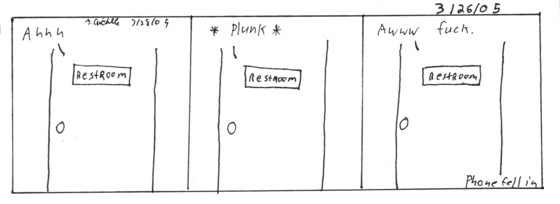Comic 1 I go to band practice every saturday, since nothing interesting happens I usually don't right about it, but every once in awhile.Comic 2 Eventually we set up shop next to the Dairy Queen. I would try to get people to sign the band's mailing list, Tiff(looking like a homeless person)held the ign for the band, Andrew M. danced and a friend named Jeff stood and ate ice cream. At one point there was a nice size crowd, unfortuantly Jay and Andrew couldn't stop arguing, but they got a lot a people to sign their mailing list. Comic 3 It kinda still works, except for the up arrow and the 2 and 5 button. Was annoying because I can't really text anybody cause I'm missing a,b,c,(looks at phone)j,k,l.