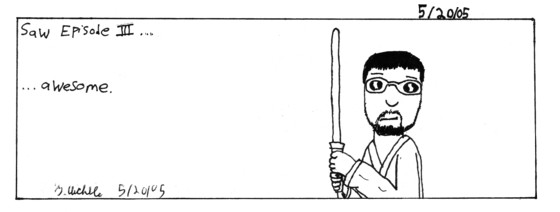 Went to see Star Wars Episode III Revenge of the Sith with Andrew. It was good, like any Star Wars fan I'd say it was better then the first two, but honestly I haven't watched them in so long I forget. In any case this one was pretty awesome. I plan to see it again next week with Dave. It was wierd seeing Darth Vader in a new Star Wars movie. Especially when he was being emotional. Well go see it, it's worth seeing. Nice jedi character I drew up. Unfortuantly my character from Knights of the Old Republic doesn't look as cool.