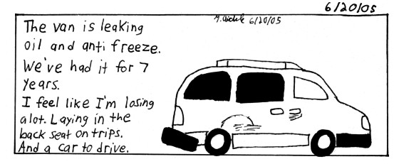 I was going to write about how tired I was. But I had to get Kelly the car. On the way back we began to worry that the car wouldn't be able to go anywhere cause of the leak. That it wouldn't last long. If we lose the van, somebody has to be stranded. I like that we have the other car cause we can each have a car. Also the many many many memories I've had in that car(and a few bad ones Ahem). Of loading up the van to go play shows in the basement. Of laying in the back seat while on long drives to various places(which added to the very high milage of the car). As corney and sad as it sounds, it be like losing a member of the family. *sigh*. Hopefully we can get it fixed and keep it for awhile longer.