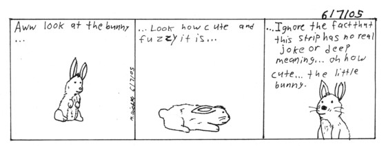 Yea, it was hard thinking up something funny, since I started this whole comic a day thing. Espeacially since nothing really interesting happened. Here it is. This is funny for two reason. First off, it's the bunny. Just the fact that it's there. Two, the fact of admiting the absence of humor, makes it funny. I'm just exploring what is funny, cause nothing interesting happened.