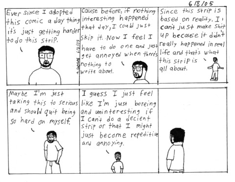 I guess I take this comic seriously. I'm begining to worry that maybe just a little too seriously. However I think it's important to keep what my comic stands for. It's really about telling the interesting(but mostly funny) things in my life. I think it adds to the comedy knowing that it's real. I also don't want to do things just so I have something to write about *sigh* Those other webcomics got it easy. *cues the violins* Don't mean to be sappy, but eh that's what this comic does sometimes.