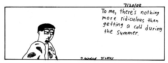 I feel like utter and complete shit. It's fun waking up at 6:30 when you feel like crap. Well only one day left of class and work. I'll make it. Cold's in the summer are as lame as commercials for back to school supplies. IT'S THE MIDDLE OF JULY FOR FUCK'S SAKE. Okay, too tired to rant further. Later people.