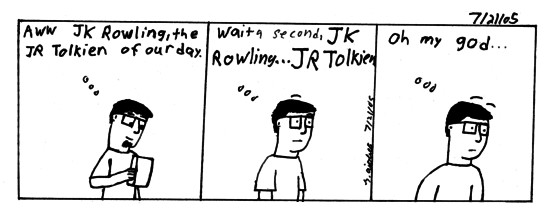 I feel a little better then yesturday. Still kinda tired but not as much. Coughing and stuff. So by tomorrow it might be better. I finished my class today. I had an awesome final project. I just wish I had music in it. Hopefully I'll burn all the stuff and save it for the future. I felt embaressed when my teacher pointed out I used my cartoon self in my animation. I don't really like either writer. I at least think it's true. Cause Tolkien was the popular fantasy writer of his day, and Rowlings is the famous fantasy writer of our day.