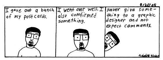 The problem with the postcard was because the text on the side went straight down. It's a big mistake cause it doesn't read well. Which I agree with. Otherwise everybody loved it. I fixed it so when I print again it'll be better. A friend of mine went right onto the site before the digital photography class to check it out. She really loved it. There was a girl who read my comic and totally loved it. It made her want to do the same thing, which made me feel good cause I inspired someone to draw their own comic. Goodnight. |