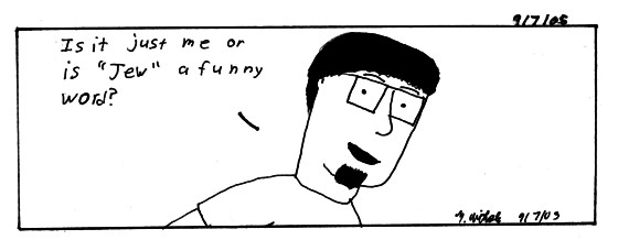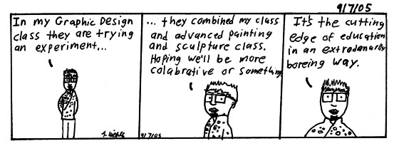 Comic 1 I'm not really against the idea of the whole putting different types of artist togther to see what you get. The teacher promises that we'll still learn everything that we need. So I'm not worrying about being cheated out of learning anything. It's just that the painting teacher is kinda annoying. I may be overreacting, but I do find her frustraiting.Also I drew myself in drag to pay omage to the guy who originally came up with the punchline. I'm sure people who know me could guess who the person is. Eddie Izzard. I also did this cause I always wanted to draw me as Eddie. Comic 2 I did the yea I said it comic, for two reasons. One, because I thought I shouldn't. The second was because I truely thought it was funny. I originally thought of this when I was in my computer animation class. They were talking about building a jewish muesam in philly. Everytime they said Jew I giggled. Cause it just sounds funny. It may be just me.