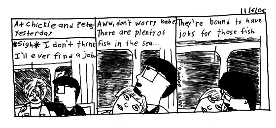 Yea, Darcy been having some bad luck with jobs, so I tried to help in my usual way. Say something dumb. Ironically I was worried I'd forget it, so Darcy wrote it down on a matchbook. Unfortuantly when I was drawing it at work today, I didn't have it. So alas I made it as close to what I said as I could. Don't get me wrong, it is incredible close, but I think it does lack certain phrasing. In either case, I do like it.