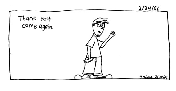 Second. A visiting artist was lecturing the graphic designers. She was passing around pieces from her portfolio. One piece that came around was four or five mailers advertising events for the Philadelphia zoo. It was folded, so I tried to unfold it and I accidentally ripped it on one of the folds. Making it worse was one of those moments were it gets quiet at the exact moment of embarrassment. Luckily she turned to me and said "don't worry about it, I got a bunch of them". I didn't do it on purpose, I didn't want it to seem I was trying to disrespect her portfolio. Later on I was walking and my old photo teacher said "I wasn't really surprised you did that". Which made me feel like shit. I guess he won't let me forget mixing up the chemicals in the photo lab. I'm just thankful it wasn't anything to bad and I wasn't going to ask her for a job. HA, cause she hires people at a graphic design firm, very lucky.