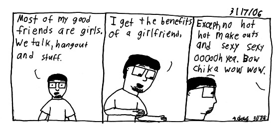 I made the last panel soooo cheesy that non of my friends that are girls think that I'm a pervert. Being a goofy dork beats being a pervert anyday. I also like how I'm getting back to the sex jokes I use to make back in the old days.