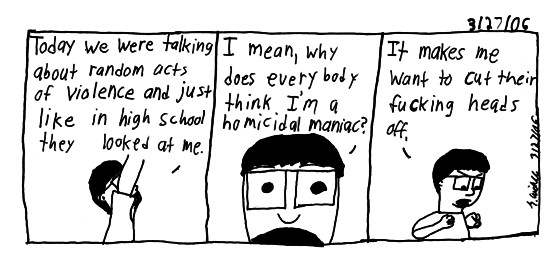 If you haven't noticed before this isn't a very kid friendly comic strip. Fowl language, violence, advocating violence, suicide, sexual content, and depression(even though Charlie Brown had to be a manic depressive). But hey, it's real life and as I started I am still unapoligetic. Also luckly nobody complains about what I say. WOOOOO it pays to be obscure and underground, you get less hate mail.