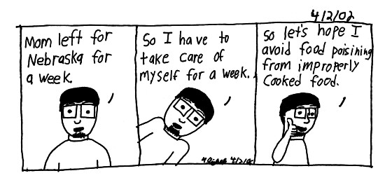 Well Mom's in Nebraska for a conference or something. So I'm left here. I figure I'll spend most of the week in the animation lab anyway so it's not to bad.