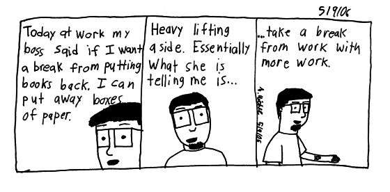 I miss my mp3 player, I got no music at work. I was working so hard, re-shelving books, getting books, scanning books all that shit. Grrrr.