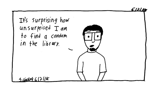 When it comes too weird things involving sex, two previous events come to mind. First, a couple of years ago a used condom was found. One of the ladies that works here put on plastic gloves and threw it away. Kinda funny. Second, somebody printed out about 100 or so pages of internet porn and shoved it in a few books. Now I don't count the random folks that come in here and look at porn on the computer. No no, this is totally different.