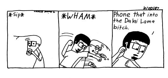 I like this one haha. But I feel this calls for a slight explanation. For those of you who have seen Wedding Crashers. There is a scene towards the end of the movie where Vince Vaughn punches the jerk boyfriend of Rachel McAdams and says "Share that with the Dalai Lama, jack ass!" For some reason I remember it as above. So I decided it sounds like an action hero line. Which ends up here haha.