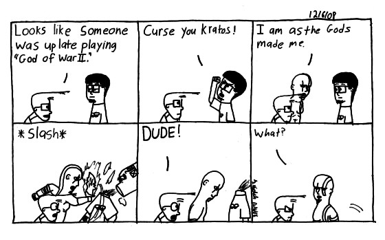 Up to where I was up late playing God of War II(11, but I had work at 6) is true, everything else is made up. If you couldn't guess.