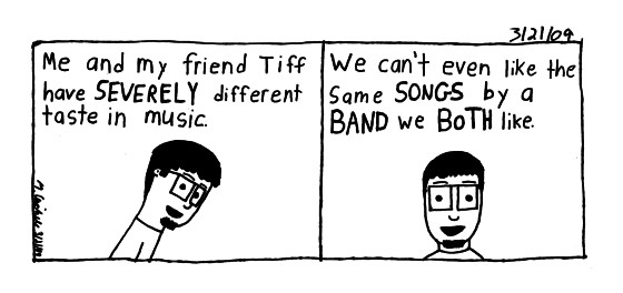 It's true. I'll even give you an example. I'll say Classical Arrangement by Dillinger Four is the best song on the record, in which she will scream hell no or Playmate of the Year by Zebrahead is cool, which she'll just laugh at me. Yea.