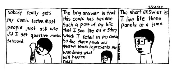 This is the first tattoo I had to explain really. All the others kinda explain themselves. I mean if you didn't know me you'd wonder why on earth would I tattoo such weird things. But most do know me and they figure it makes sense. In the end when you think about it the question mark comic makes sense too. But nobody thinks when the look at it "Hey it's a comic strip." I think cause the marks kinda overpower the outline surrounding em.