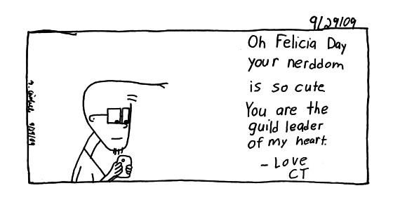 It's a love filled day. I finished this comic and now Cartoony confesses his (by proxy my) love for Felicia Day. The spunky and socially awkward girl from The Guild. I guess it helped that I watched the new episode of the Guild and Dr. Horrible's Sing A long blog today.