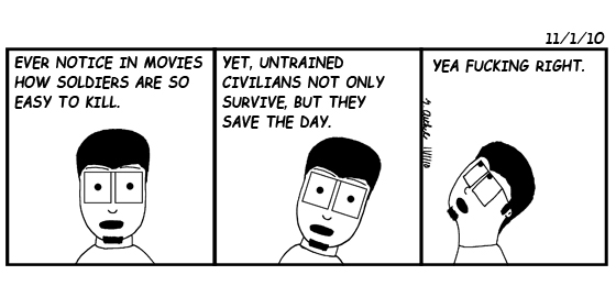 This point was brought to my attention, a long time ago, by a friend of a friend who is a soldier(Sorry I don't recall the name) while we were talking about Cloverfield. He was annoyed with the portrayal of military in movies. Also recently I saw the trailer to Skyline, which really brought this idea home.