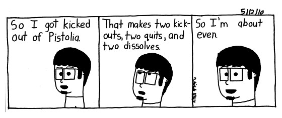 In order, Without Parachute:Quit, No Life Line:Quit, Backwards Alphabet:Kicked out, Pistolia V.1:Dissolve, Twenty One Up:Dissolve, Pistolia V.2:Kicked out. Ah memories.