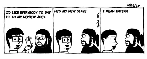 You may also notice, loyal reader, something different about the comic. I used a typeface instead of my handwriting. I worked out a way to do new comics while here in New York. I piece images together in photoshop and just use type for the dialogue. Let me know what you guys think, keep it or ditch it.