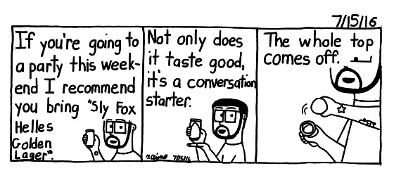Slyfox Helles Golden Lager. Every time I bring it to a party it's always interesting. Now worry not dear readers, this isn't gonna become a new segment or something(though I may make more beer jokes). I'll leave beer reviews to my friend Jay of Philly 5 Min Brew Reviews.