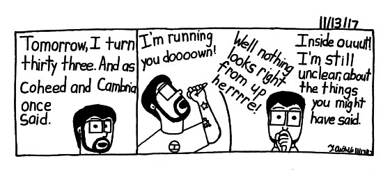 "Patrick short flip and outside. We're bringing it home. Hold on to the things you favor most. Shift right and let it run down. If my peace could find a way out. Let go of the youthful honesty." (33, Coheed and Cambria)