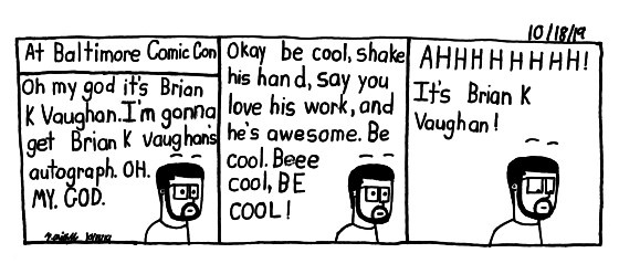 Live from Baltimore Comic Con. Indeed, I did get the autograph from Brian K Vaughan. He was really nice and I gave him one of my comic intros. Exciting.